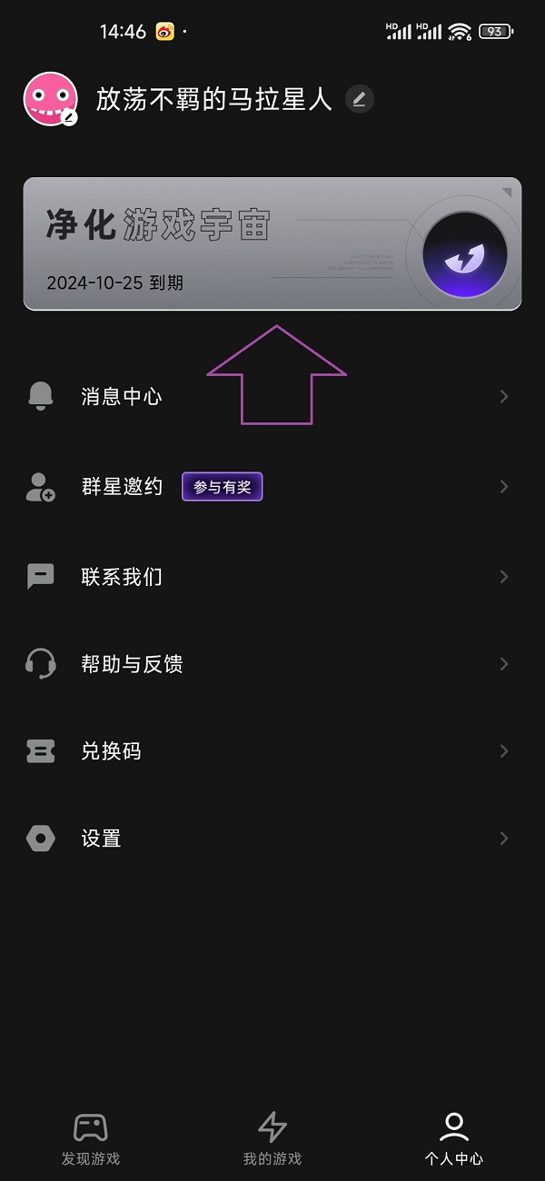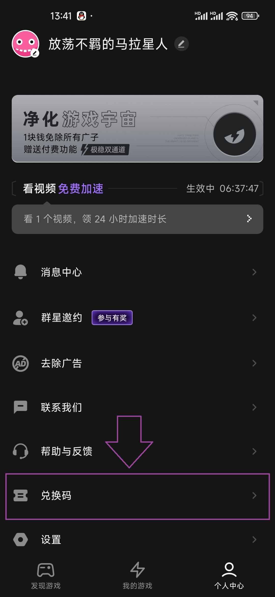 第一步:打开外星人加速器,点击底部导航【个人中心】,进入会员中心,下滑点击列表中的【兑换码】。